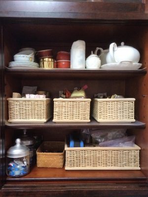 【食器棚After】 種類ごとに大まかに分け、かごにまとめることで出し入れもしやすくなり、見た目的にもすっきりしました。 また、ストック管理のしやすさにもつながります。