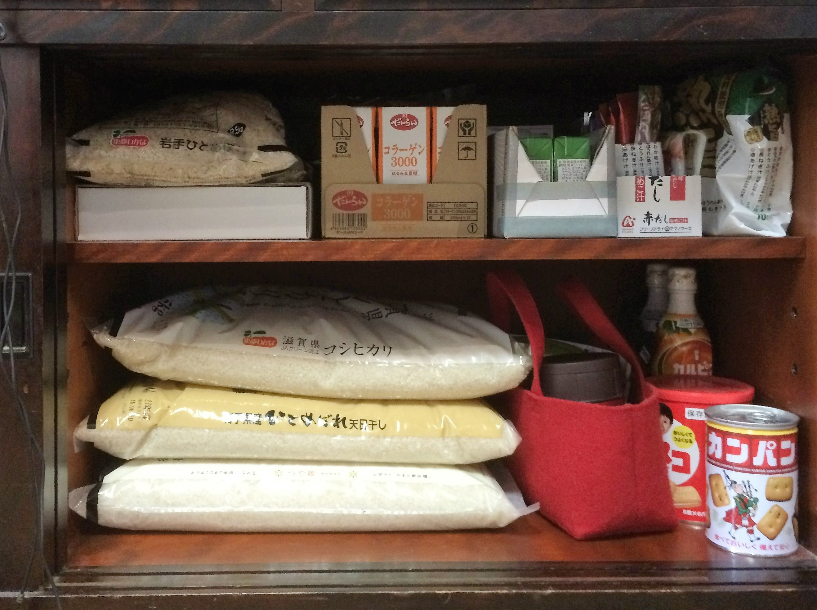 【食器棚下After】 食材ストックのみを置くようにしました。 小さいものは奥から手前に縦一列に収納します。購入時のパッケージごとざっくり収納することで、在庫が減っても置き場所を確保できます。